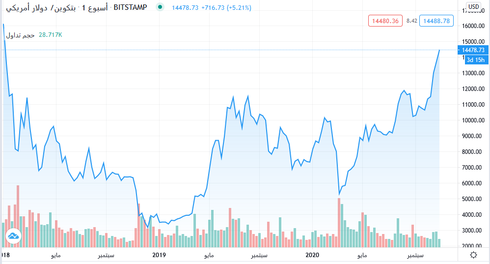 منذ الأسبوع الماضي حتى الآن تعيش البيتكوين حالة من الانتعاش، حيث اكتسبت العملة زخمًا صعوديًا حتى وصلت لأعلى مستوياته منذ يناير عام 2018 مخترقة مستوى 14000 دولار بعد اجتيازها مستوى 13000 دولار، وسط توقعات متفائلة باستمرار الاتجاه الصعودي لتصل إلى مستوى 17000 دولار بنهاية هذا العام.