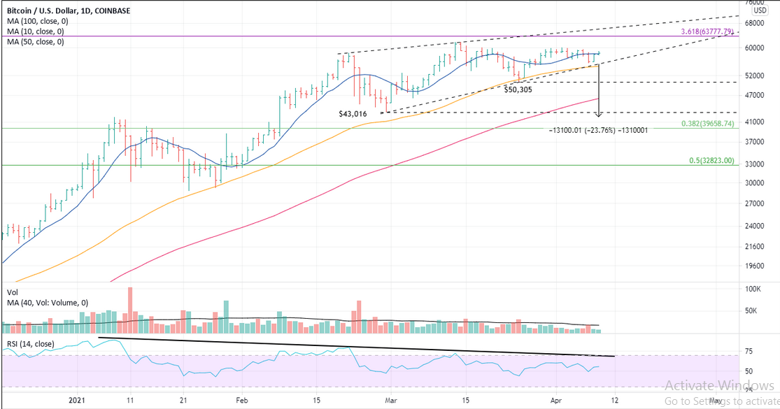 ومن الجدير بالذكر أن العملة المشفرة كانت تتقلب في نطاق 59000 دولار – 55800 دولار منذ 15 مارس مع الاستثناء الوحيد هو فترة الأربعة أيام بين 23-27 مارس.