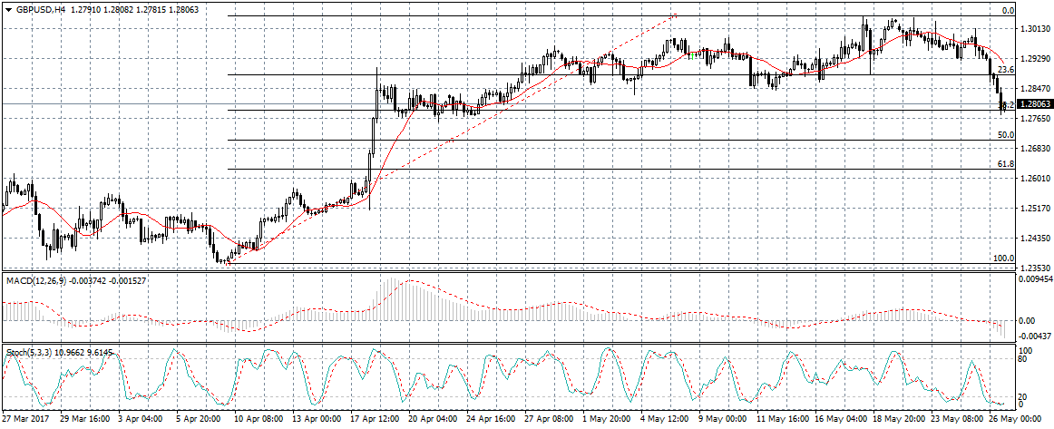 يتداول زوج الجنيه الاسترلينى مقابل الدولار الأمريكى عند المستوى 1.2805 , حيث ارتد الزوج نحو الاتجاه الهابط مستهدفا مستوى الدعم بالتزامن مع وجود خط الفيبو 38 كما هو موضح بالرسم.