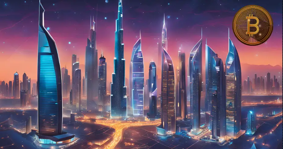 Dubai city skyline at night with Bitcoin icon