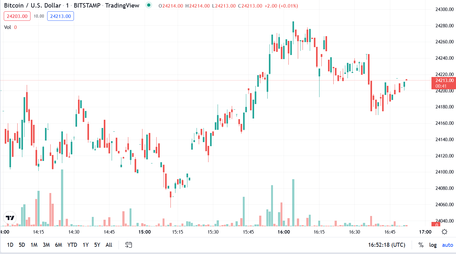 في الأسبوع الأخير من شهر يوليو ارتفعت العملة بشكل مفاجئ مما أدى إلى ارتفاع سعر البيتكوين إلى 24200 دولار، ثم تراجعت قليلاً لتتداول بين نطاقي 22000 دولار – 23000 دولار.