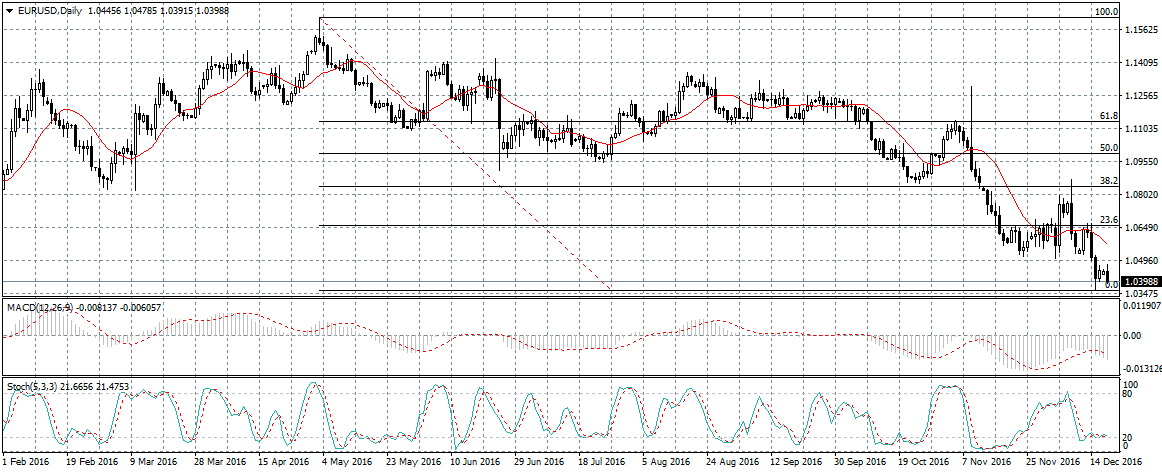 عانى زوج اليورو مقابل الدولار الأمريكى من هبوط حاد خلال تعاملات الأسبوع الماضى فى سوق فوركس بسبب بيانات البنك المركزى الأوروبى والذى أجل رفع معدل الفائدة الى عام 2018 , بالاضافة الى بيانات بنك الاحتياطى الفيدرالى الأمريكى والذى قام برفع أسعار الفائدة بالفعل مؤديا الى ارتفاع الدولار الأمريكى بقوة كبيرة فى مقابل سلة العملات الرئيسية لينهار بسعر اليورو الى أدنى مستوى فى 14 عاما ملامسا مستوى الدعم 1.0364